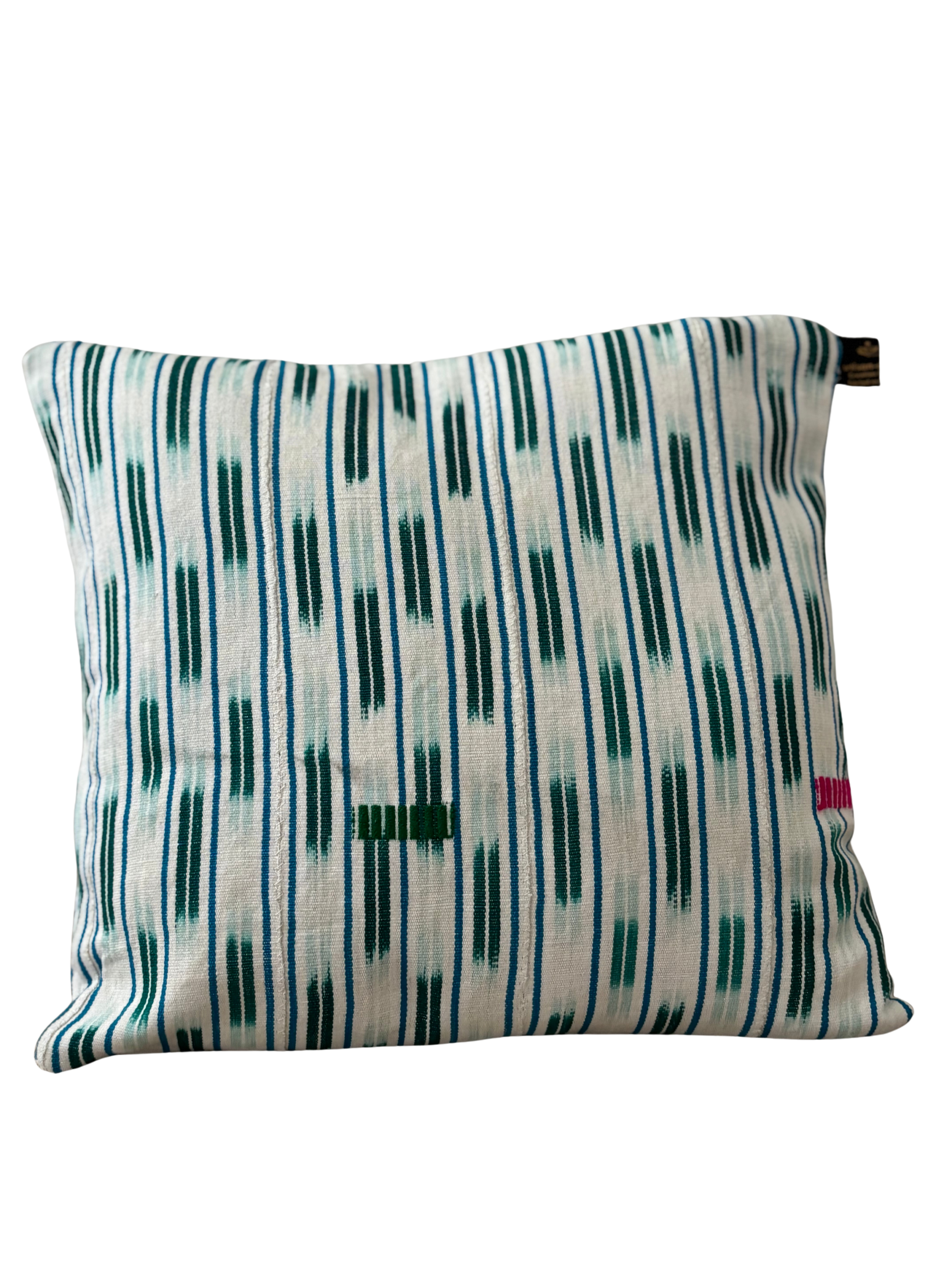 Ces Taies d’oreillers confectionnés avec Le Pagne Baoulé (Wawlé Tanni en langue Baoulé), un tissus traditionnel tissé à la Main dans la région centre de la Côte d’Ivoire par le Peuple Baoulé. A partir de fils de coton et ou de fil de laine des bandes sont tissés sur des métiers à tisser en Bois. Les bandes obtenues sont ensuite cousu à la main, cet assemblage forme le pagne boulé de différentes dimensions.
